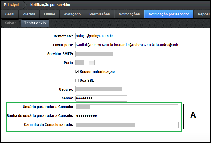 B – Caminho da console na rede: Verifique e preencha com o caminho do executável da console na rede (caminho é indicado ao instalar o NetEye, sendo definido por padrão como “NOME_SERVIDOR_NETEYE\Neteye\Console\Console.exe”).