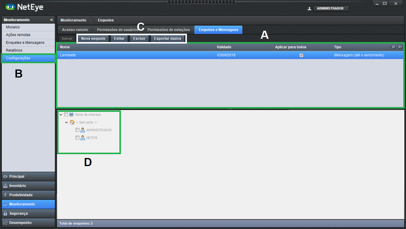 A: Se habilitada, coluna aplica enquete/mensagem criada para todos os usuários monitorados pelo NetEye;