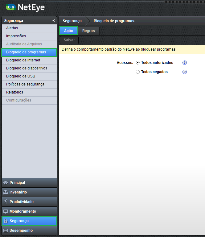 O NetEye permite bloquear a utilização de programas indesejados no parque de TI, com a intenção de auxiliar na segurança e controle de acesso do ambiente.