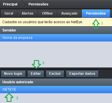 Ao acessar a console do NetEye, vá até “Principal” e verifique se a opção “Editor de Relatórios” se encontra habilitada para acesso. Caso já esteja, pule para o passo X, caso contrário, através da console do NetEye acesse “Principal > Configurações”. Ao entrar nas configurações, acesse a aba “Permissões” e siga a documentação desde o passo 1: