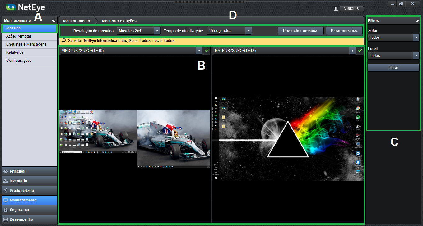 B: Área de visualização das telas dos usuários (exemplo de visualização de tela de dois usuários simultâneos);