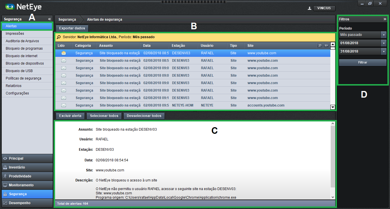 Dentro do módulo de segurança, os alertas terão como funcionalidade comunicar ao usuário sempre que houver uma tentativa de acessar algum site/programa/USB configurados para serem bloqueados, ou, ainda, sempre que um usuário tentar encerrar o processo do agente NetEye em sua máquina.